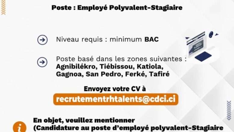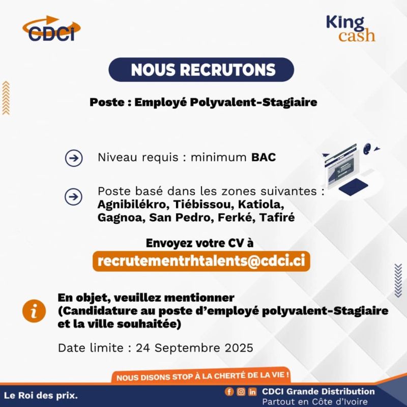 La Compagnie de Distribution de Côte d’Ivoire (CDCI) recherche des Employés Polyvalents Stagiaires pour nos différents magasins sur l’intérieur du pays.